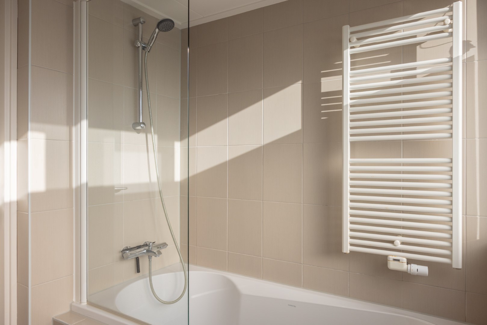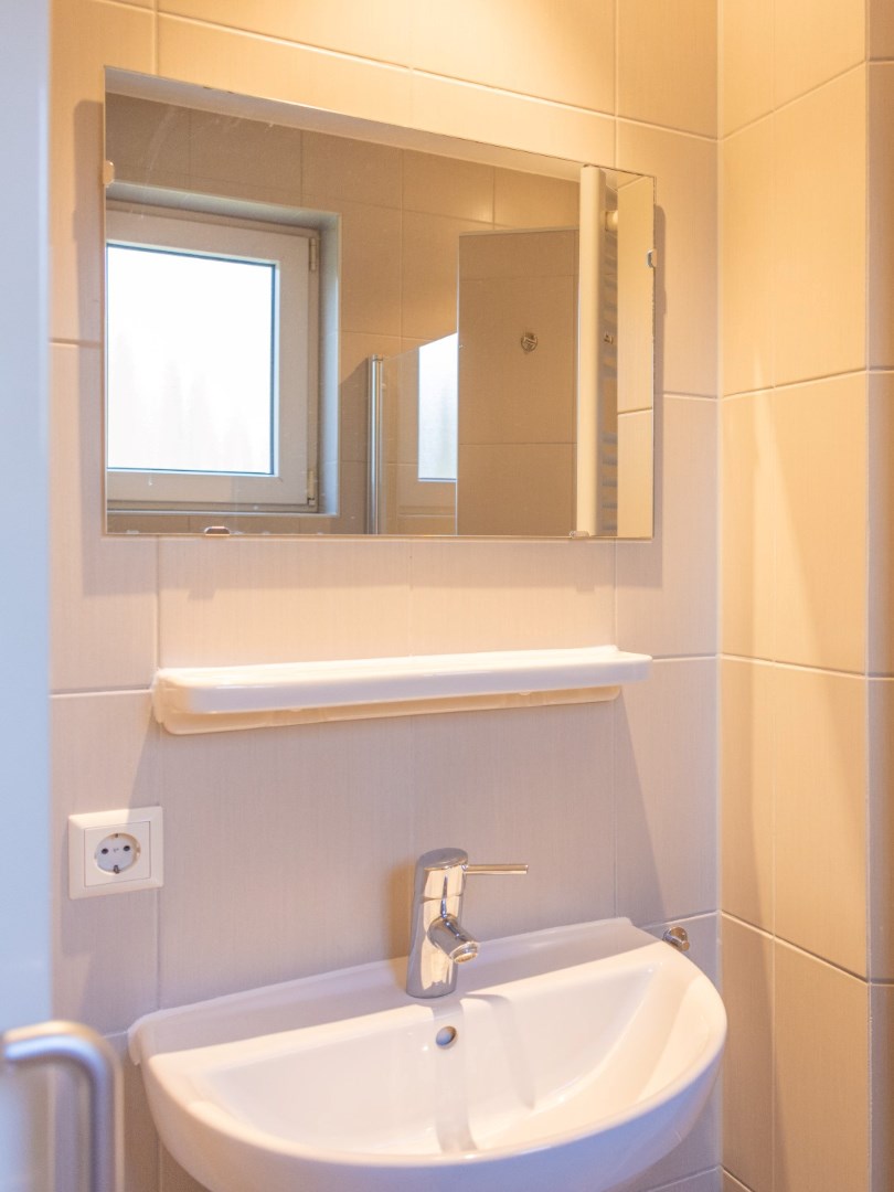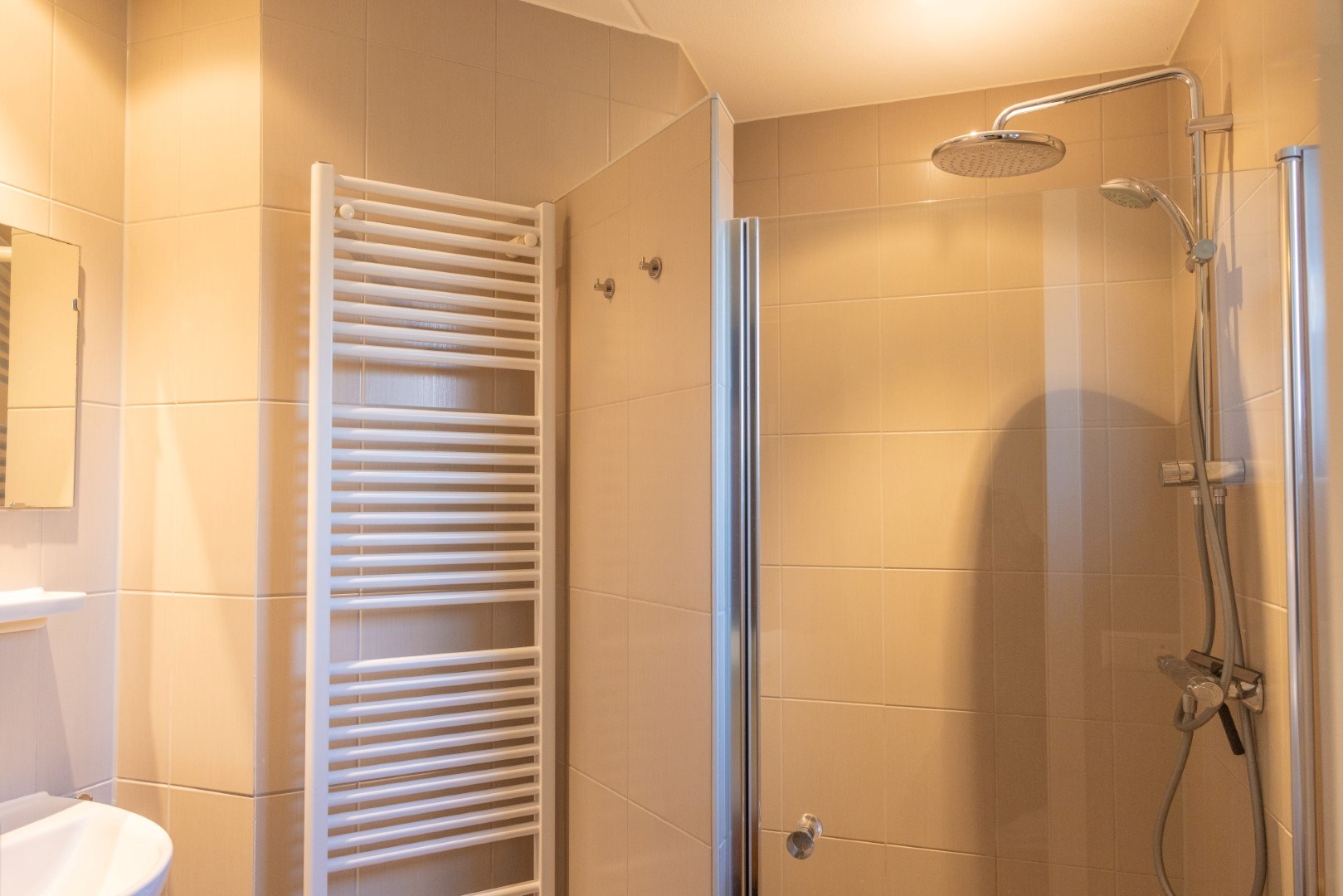 De badkamer heeft vloerverwarming, en is voorzien van douchehoek (met rainshower) en wastafel.