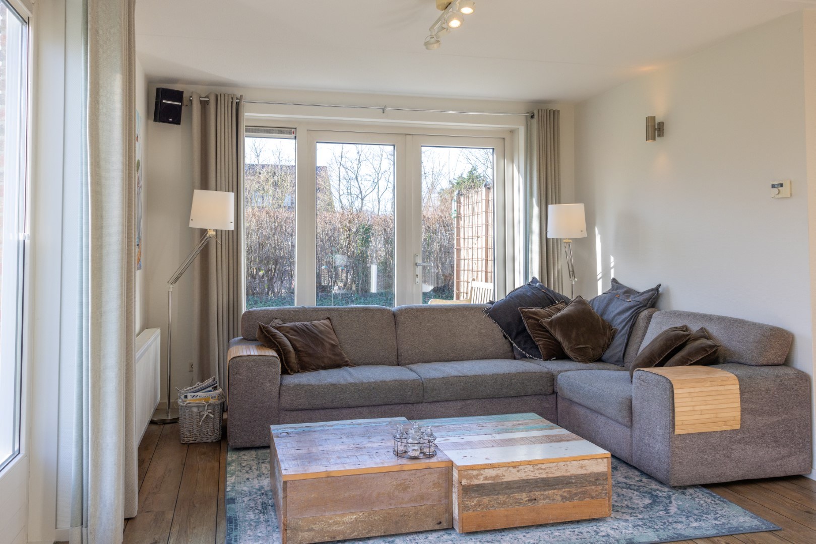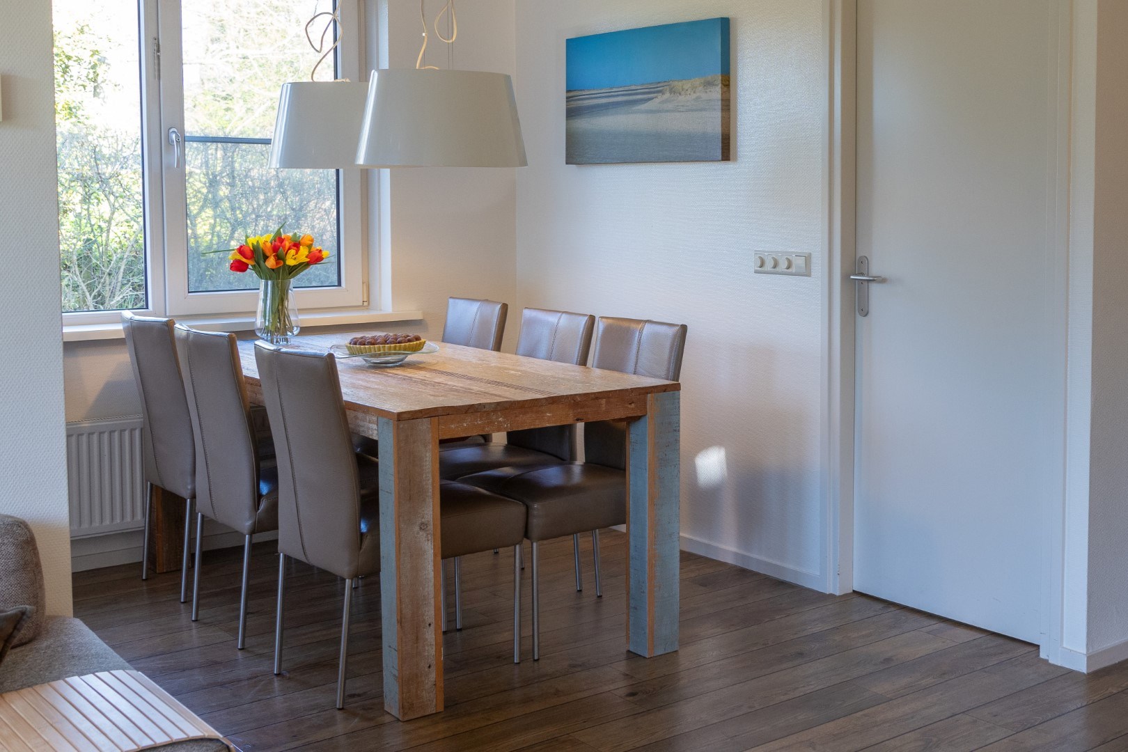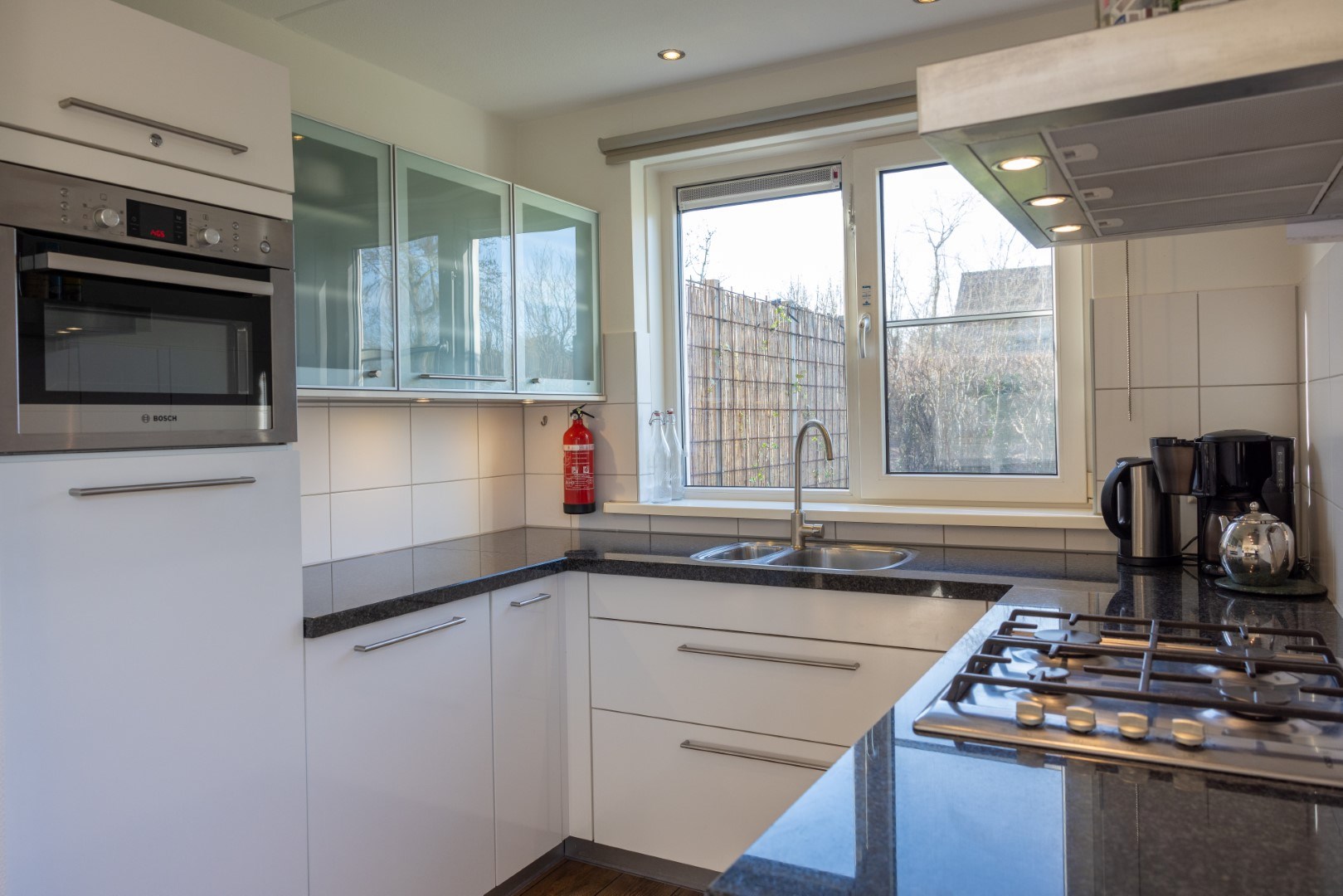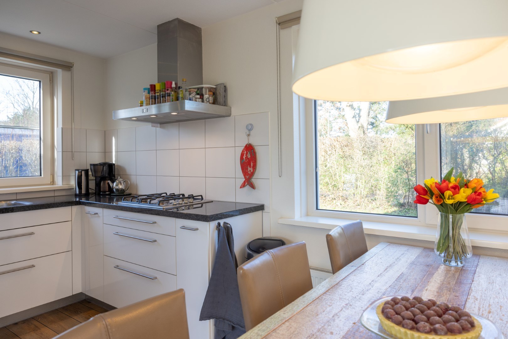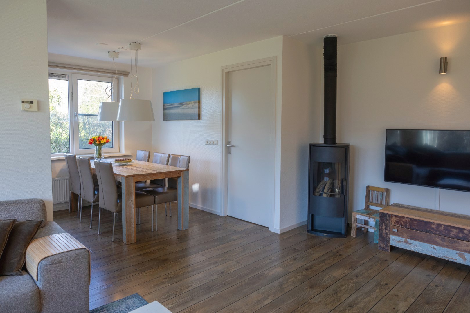 De lichte woonkamer heeft 2 paar openslaande deuren naar de terrassen en de tuin, een gashaard, en een moderne open keuken. De luxe keuken heeft veel bergruimte en is voorzien van (inbouw)apparatuur: oa. vaatwasser, combimagnetron, gaskookplaat, afzuigkap, en koelkast.
